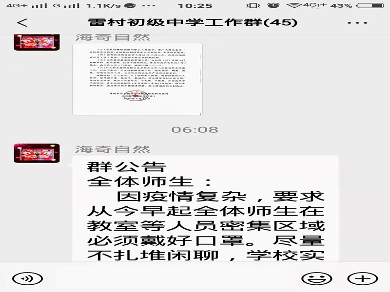 面对疫情雷村初中始终宣传疫情动态,全面落实上级疫情防控的指示精神,从严从细加强校园防控措施,确保师生健康安全。