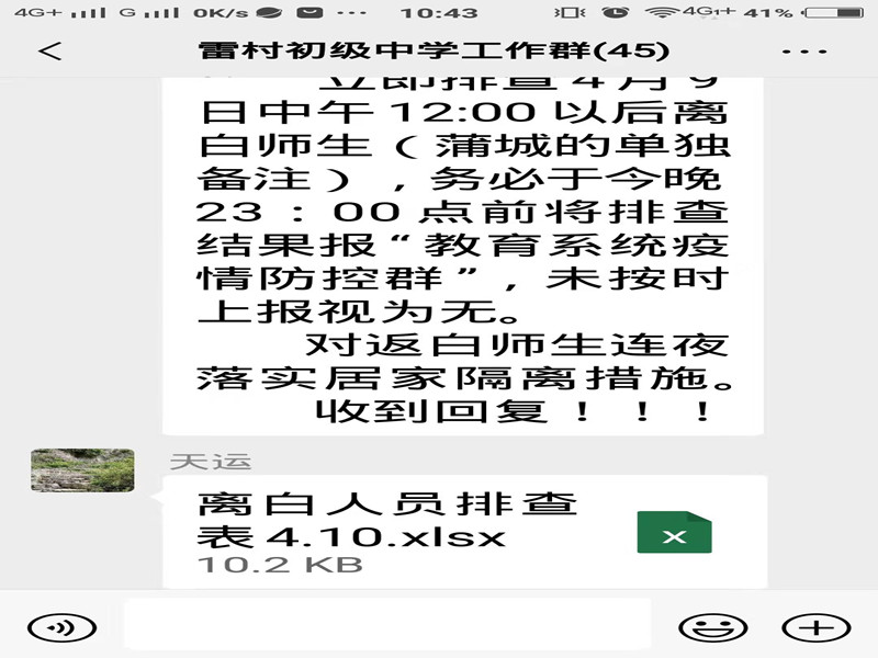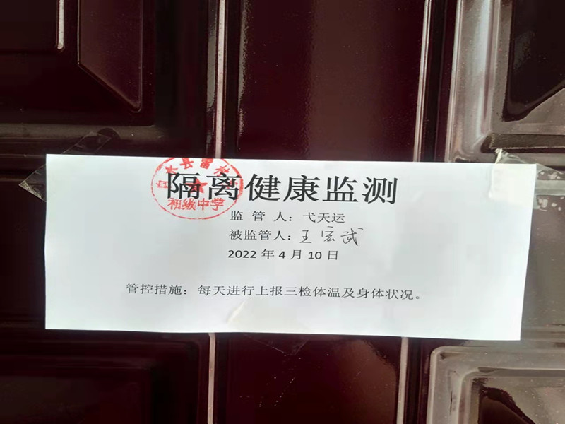 2022年4月8日,按照教育局要求排查离白人员信息统计。4月10日,周日例会,学校对离白教师提出管控要求:实行三检报告并建议服用中药。德育主任弋天运负责离白教师健康监测一周观察期。