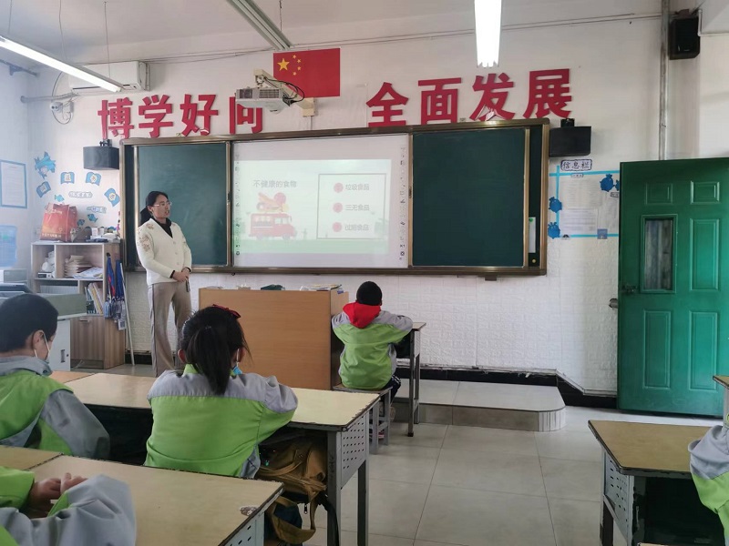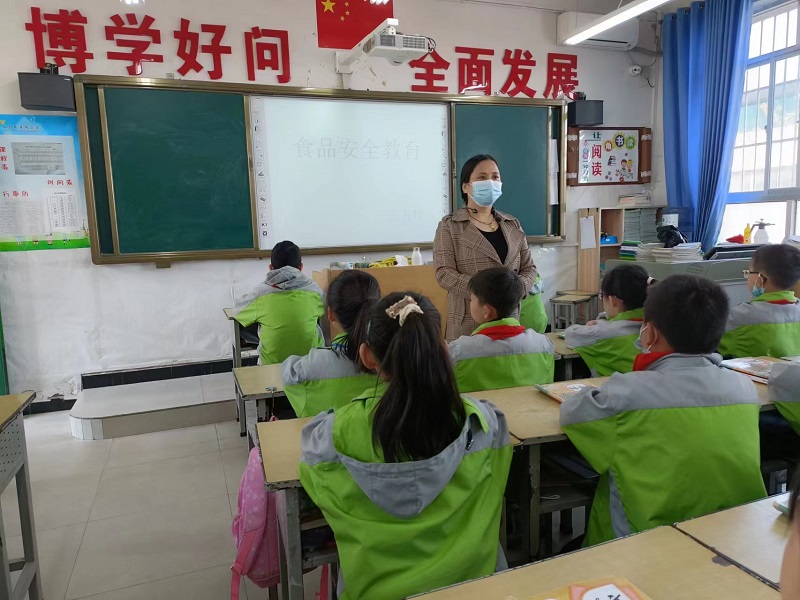 各班主任运用多媒体辅助教学,教育引导学生食品安全小常识、预防食源性疾病、引起食物中毒的常见因素以及食物中毒后的应急措施等相关知识。班主任还教育学生食用有包装的食品前,要查看生产日期、绿色质检码、保质期及食品颜色等;食用食品时,要先小口品尝,无异味后再继续食用;食用过程,若发现有异常现象要立即停止食用,并报告班主任老师等待处置,并结合营养早餐的领取、分发、食用等环节,引导学生领取要安全有序,分发要逐人足量,食用要及时定量,签名要客观有效等。