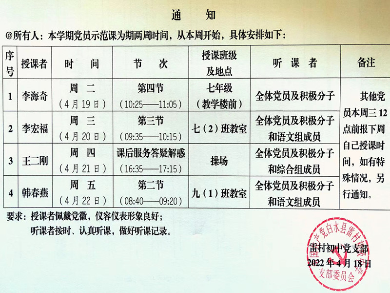 为进一步发挥党员教师的示范引领作用,展示党员教学风采,促进党建与教学工作有机融合。雷村初中从2022年4月19日起开展为期两周的党员示范课活动。