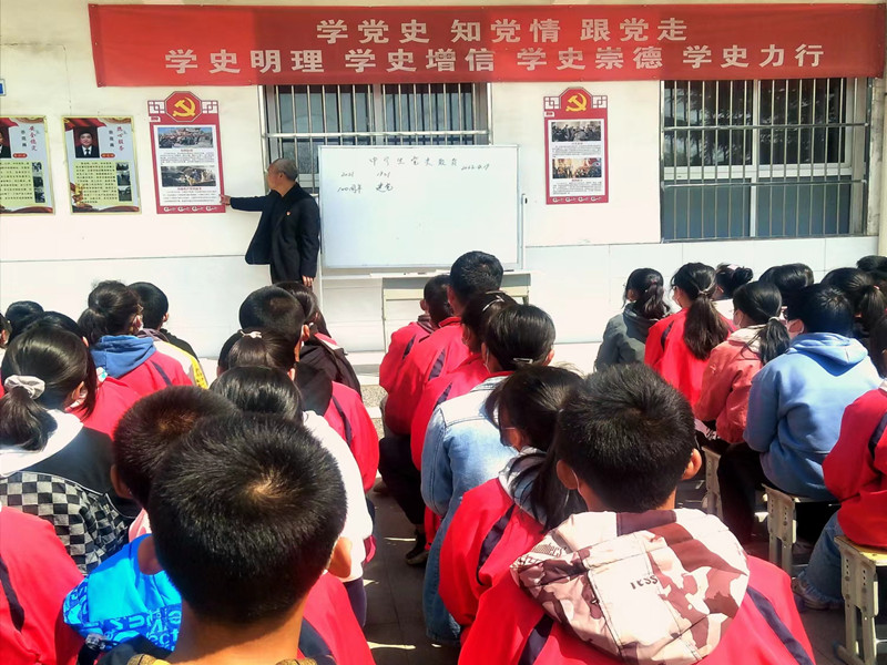 2022年4月19日早上第四节课,校长李海奇给七年级两个班同学在教学楼前上了一堂生动的中学生党史教育。
